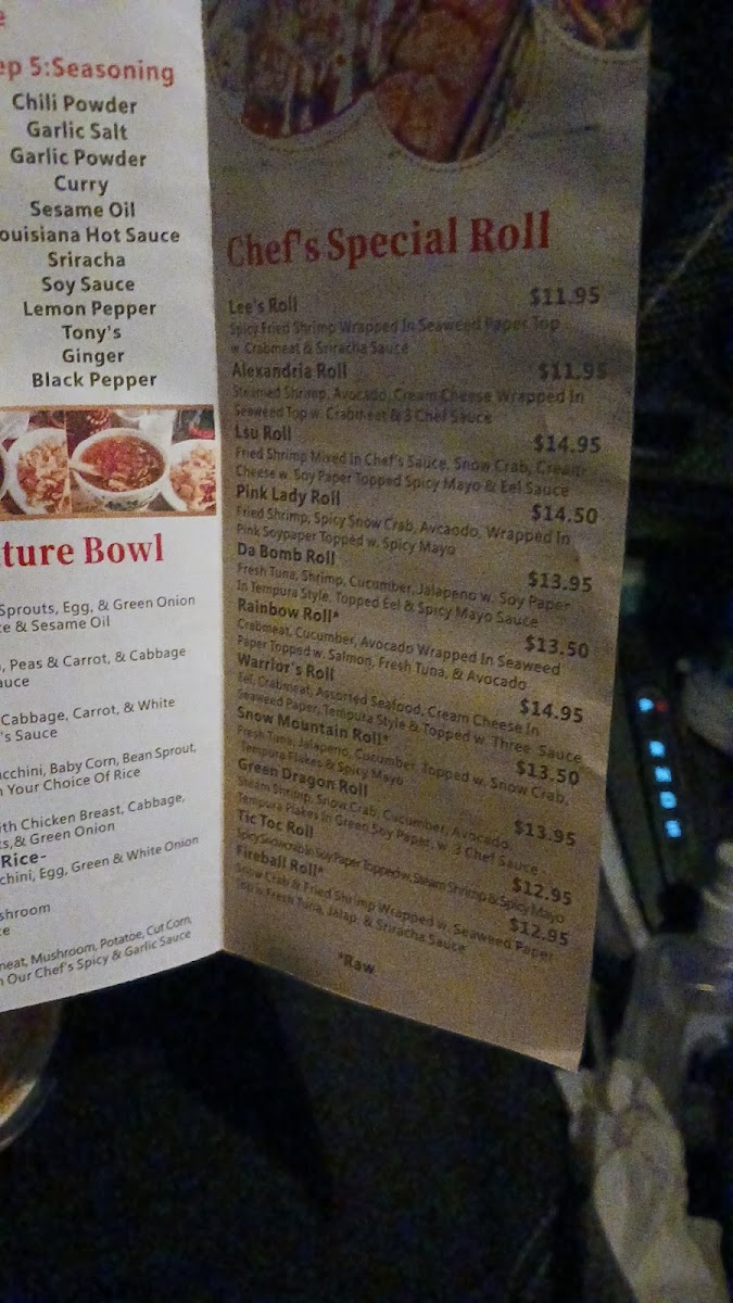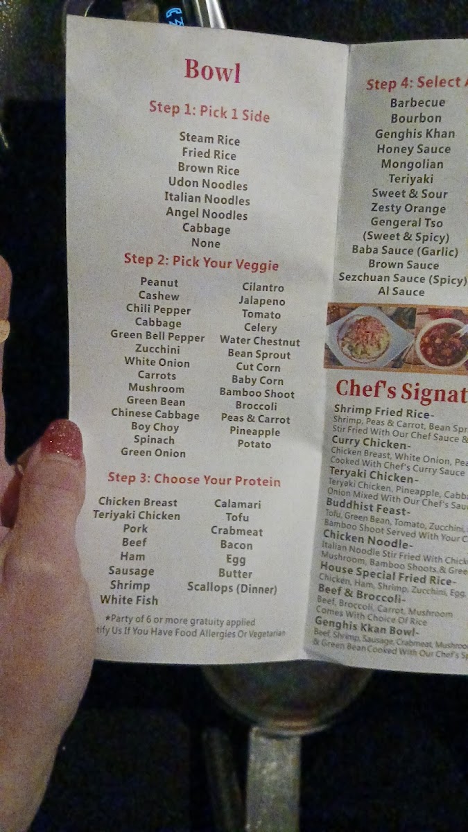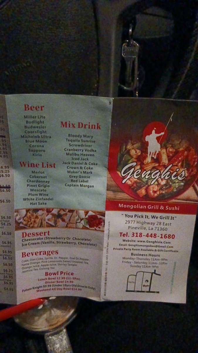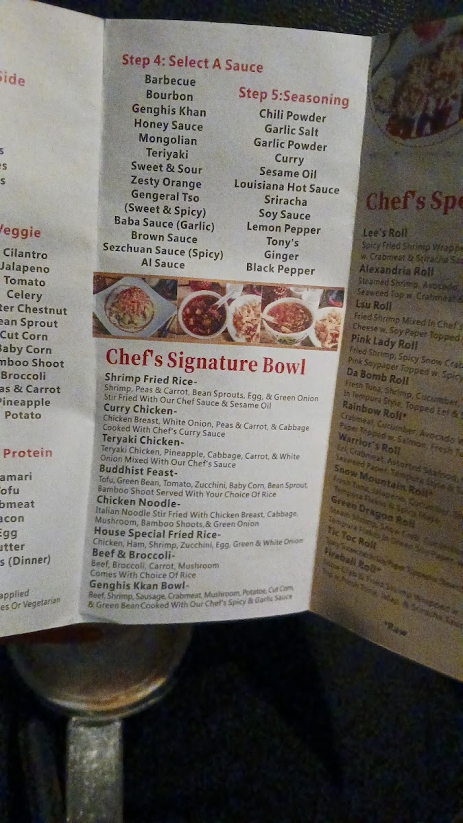 Introducing the menu at Genghis Mongolian Grill & Sushi is a flavorful adventure that invites you to create a dish uniquely yours. Located in Pineville, LA, this culinary gem allows diners to customize their meals with a selection of fresh proteins, vibrant vegetables, and aromatic sauces. Guests begin their experience by choosing a base—be it rice or noodles—and then embark down the line, handpicking ingredients before they are cooked hibachi-style to perfection.